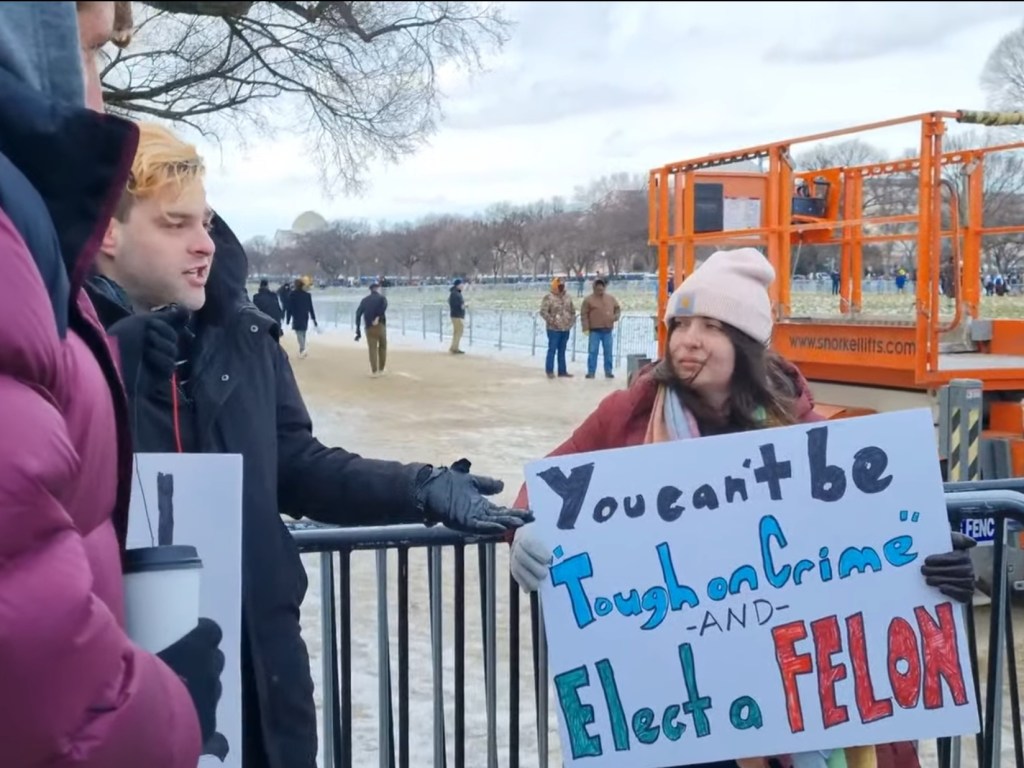 20 janvier 2025, dans le froid de Washington DC, quelques heures avant l’investiture de Donald Trump comme 47e président des États-Unis, deux hommes se font face. L’un tient une pancarte rappelant la condamnation judiciaire du Président, l’autre est un fervent soutien du Président.