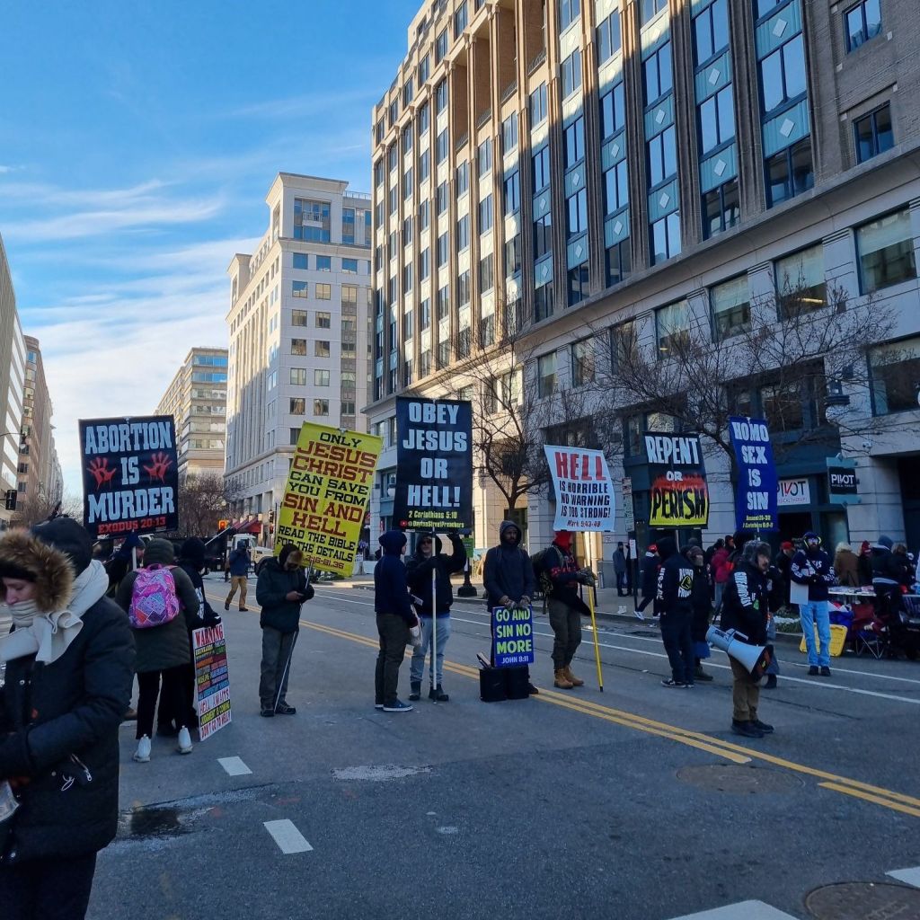 Aux abords du Capital One, ou Trump tient son discours post-investiture, des évangélistes tiennent des pancartes au message clair : « L’homosexualité est un péché ! », « L’avortement est un meurtre ! », ou encore « Les athées, musulmans, homosexuels, transgenres: repentez vous ou allez en enfer !’